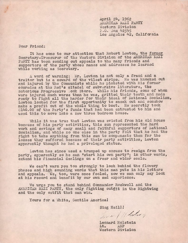 AMERICAN NAZI PARTY | DENUNCIATION OF ROBERT LEWTON