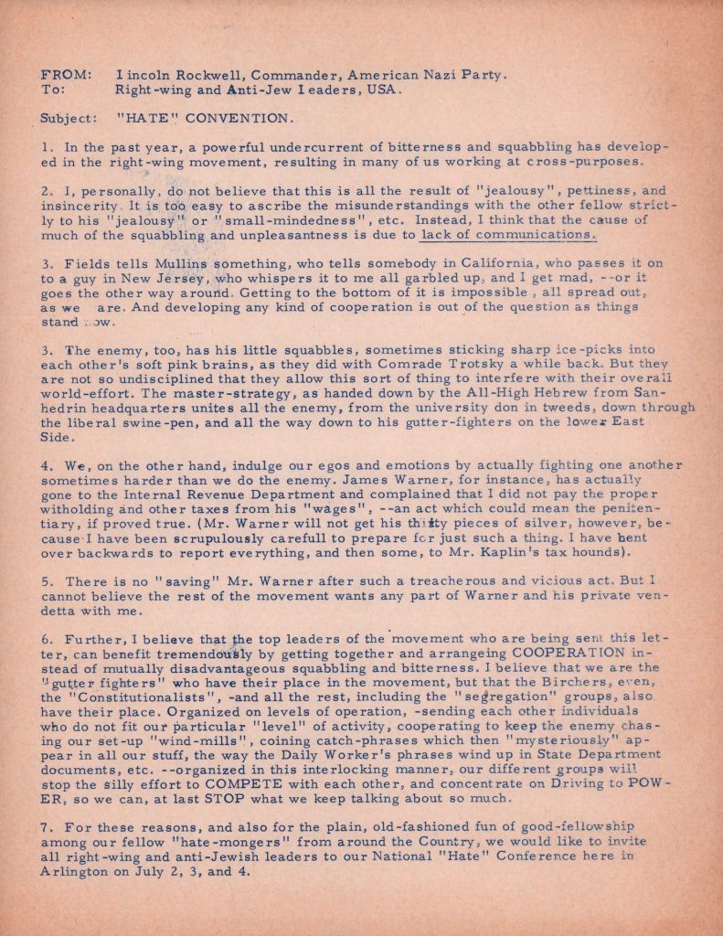 AMERICAN NAZI PARTY | “HATE” CONVENTION LETTER