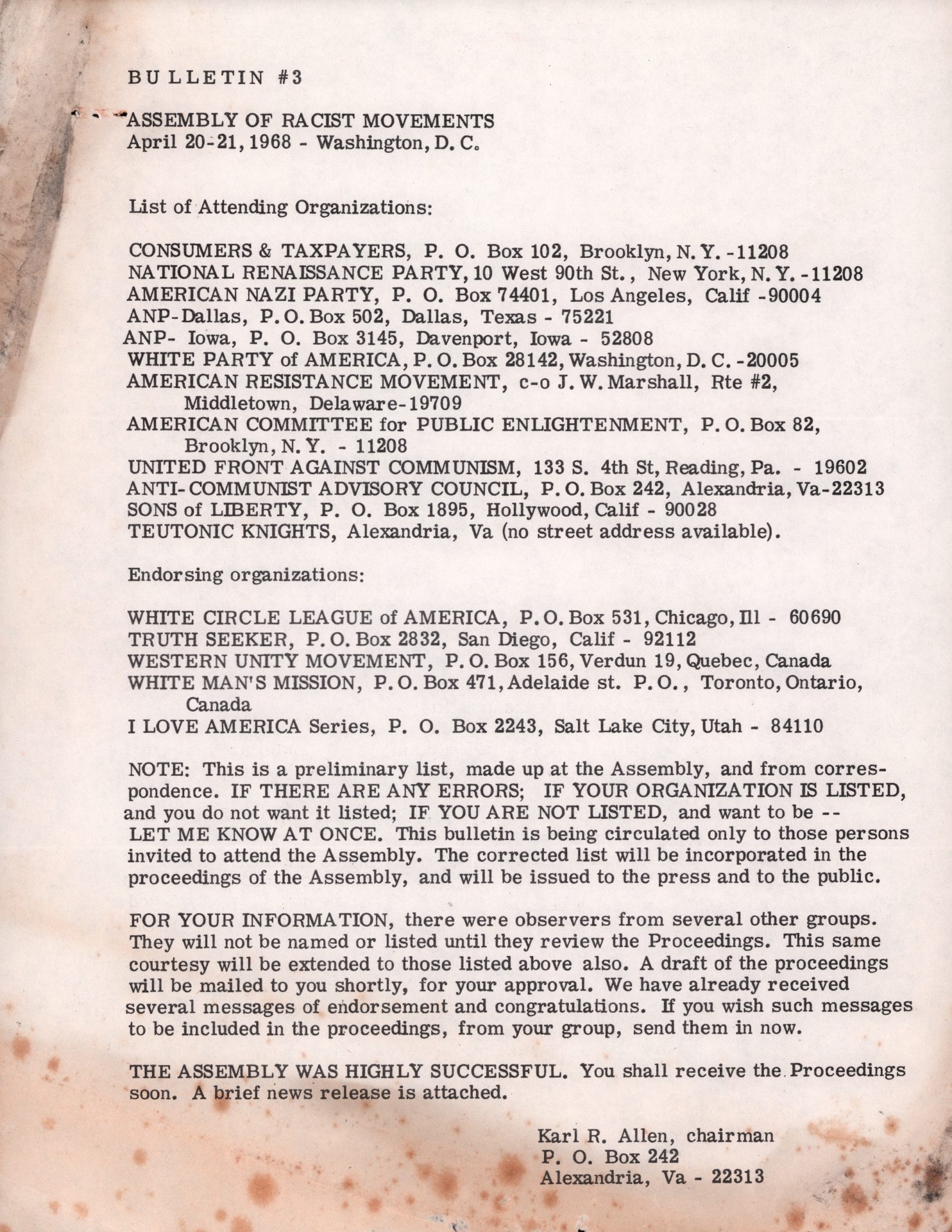 ASSEMBLY OF RACIST MOVEMENTS | BULLETIN #3, APRIL 20-21, 1968